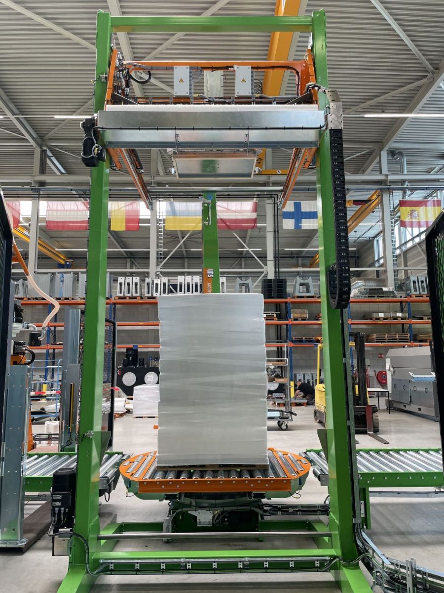 - „Stapeln und Wickeln“ möglich. Beim Stapeln mit einem Roboter kann das Wickeln pro Lage erfolgen. So kann auch die instabilste Ladung fixiert werden.