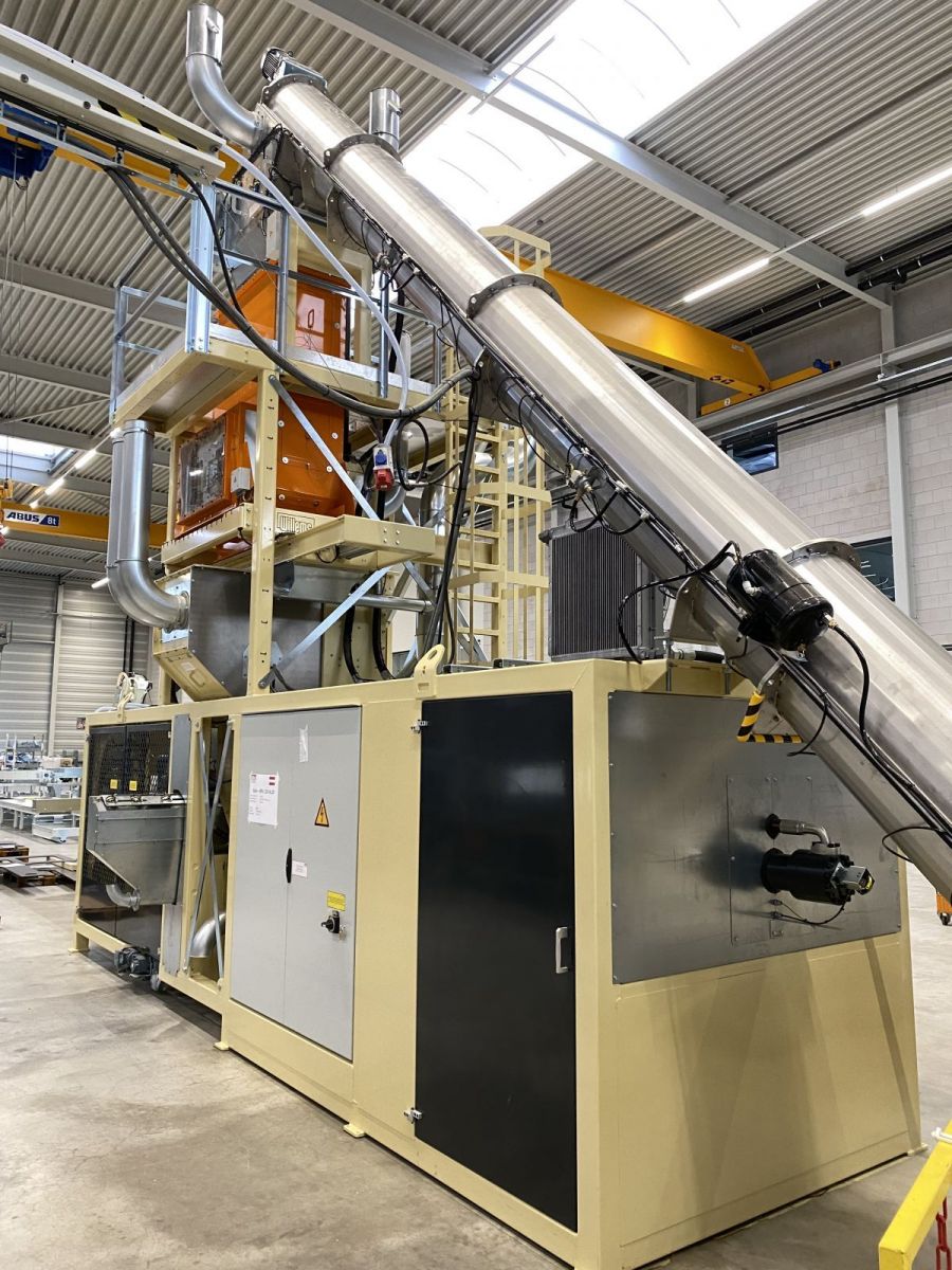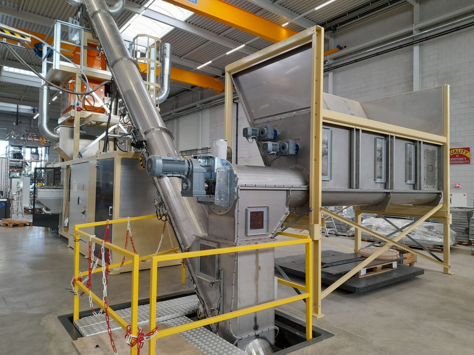 Inklusive Edelstahltrichter mit Förderschnecke. Welches mit einer automatischen Reinigungsfunktion ausgestattet ist. Dies ist bei einem Produktwechsel in der Verpackungslinie notwendig.