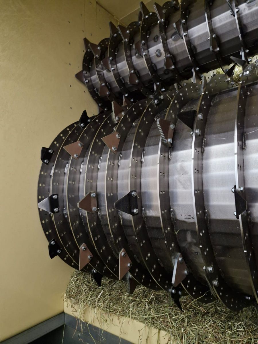 Großballen kommen vom Feld und werden in dieser Linie zu einem losen Materialstrom aufgelöst. Staub wird entfernt. Das Produkt wird vollautomatisch in Flachfolie verpackt. Kräuter und Blumen können dem Produkt hinzugefügt werden. Die Linie umfasst eine Kontrollwaage und ein Metalldetektionssystem, sodass keine Ballen mit falschem Gewicht oder Metall durchgelassen werden. Inklusive Drucker zum Aufbringen des Datums und MHD (Mindesthaltbarkeitsdatum) auf den Ballen.