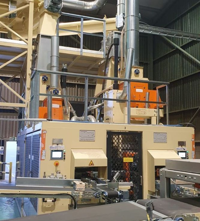 Komplette kleine Verpackungslinie. Die Linie besteht aus der Erweiterung des bestehenden Versorgungssystems, der Doppelballenpresse, der Bündelmaschine und des Roboterpalettierers zum Verpacken von 1400 Ballen pro Stunde. Ballen mit Streu für kleine Haustiere wie Meerschweinchen, Kaninchen und dergleichen.