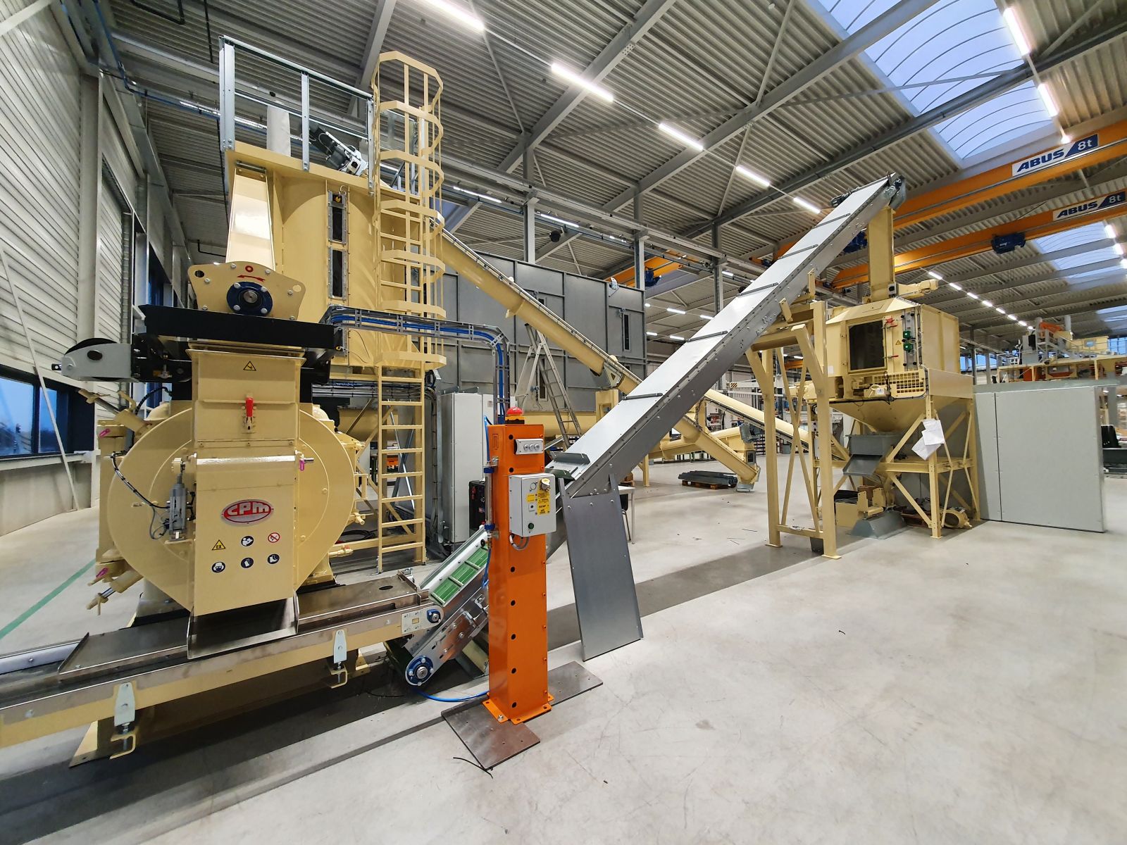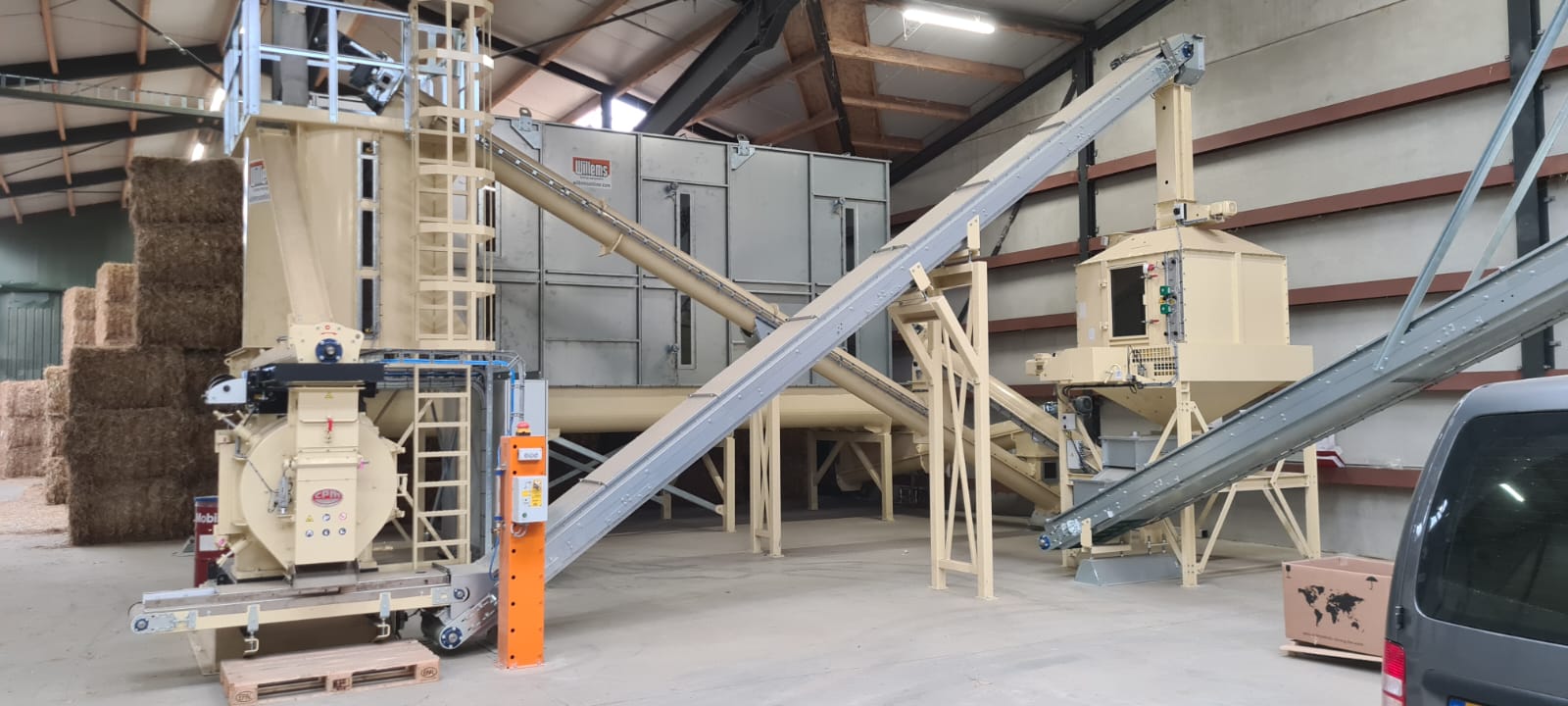 Pufferbunker, Konditionierung der Faser, Reifebunker, Dosierung zur Pelletpresse, Pelletpresse, Kühler, Staubabsiebung und Austrag der gepressten Pellets. Alles geliefert und installiert von Willems. Vollautomatische Steuerung.