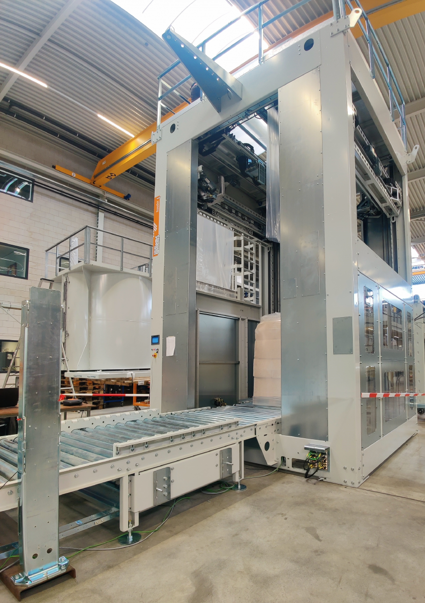 Ein Trommelsieb ist integriert, um die groben Holzspäne von Feinanteilen zu befreien, was bei bestimmten Tierstreuarten erwünscht ist. Die sauberen Späne werden zu Ballen gepresst und in logistisch korrekte Ballen verpackt. Ein Roboterstapelsystem stapelt die Ballen automatisch auf Paletten. Die Stretchhaubenmaschine ist mit 2 Folienrollen ausgestattet, die es dem Hooder L ermöglichen, eine schützende Stretchabdeckung über verschiedene Palettengrößen zu ziehen. Hinter der Haubenstretchmaschine ist ein Palettenpuffersystem platziert.