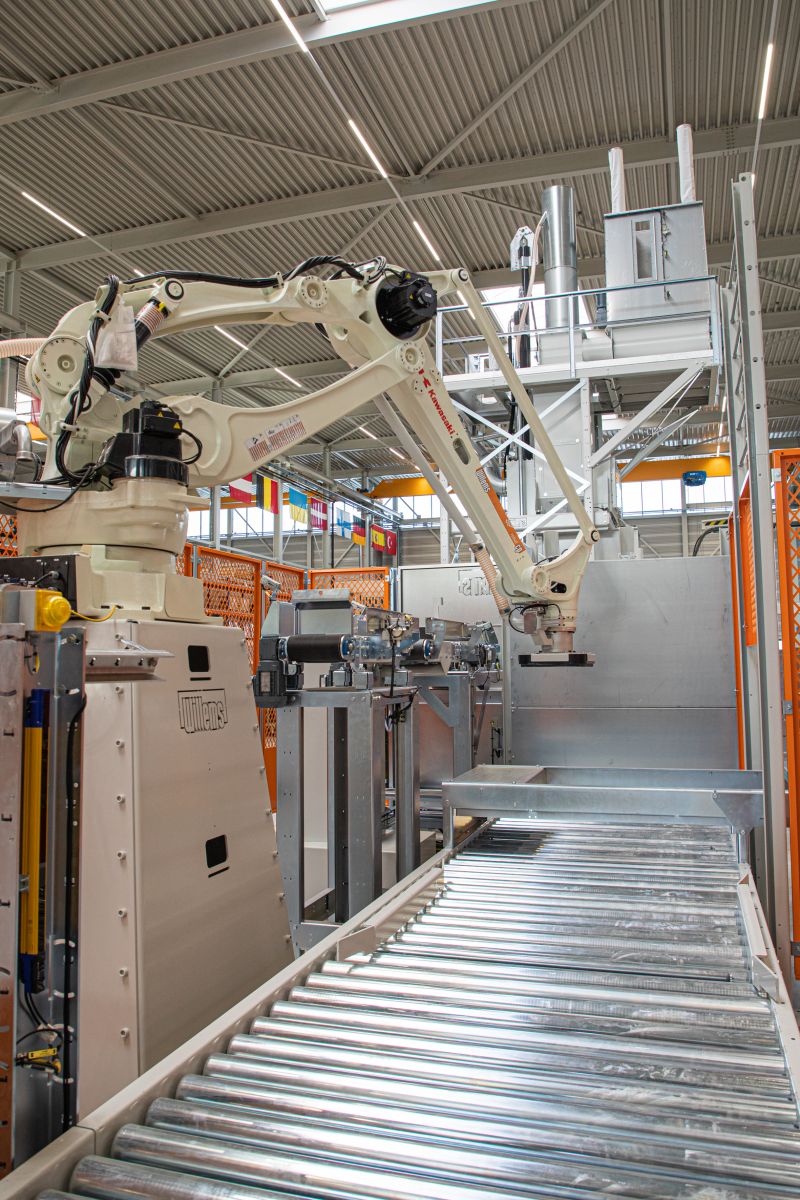 Voll ausgestattet mit einem Roboterstapler, einem automatischen Blechaufleiger und einem Ballenkipper. Eine vollautomatische Stretchwickelmaschine wurde hinzugefügt, um die gestapelten Ballen vor Wind und Wetter zu schützen. Das Ende der Linie besteht aus einem Rollenfördersammelsystem. Dabei werden die verschiedenen Palettengrößen nebeneinander oder hintereinander geformt, so dass ein Gabelstapler möglicherweise mehrere Paletten gleichzeitig aufnehmen kann. Um den Gabelstaplerverkehr auf ein Minimum zu beschränken.
