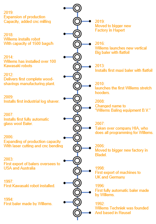 Im Jahre 1992, als Jos und Hennie Willems Ihren eigenen Betrieb unter dem Namen Willems Techniek gründeten, hatten sie noch keine Ahnung davon, dass ihre Söhne Bram und Harm viele Jahre später einen Familienbetrieb besitzen würden, der weltweit vollautomatische Maschinen und Anlagen verkauft und installiert. Turnkey Projekte und hochwertige Maßarbeit basierend auf einem großen Schatz an Erfahrung und Wissen.