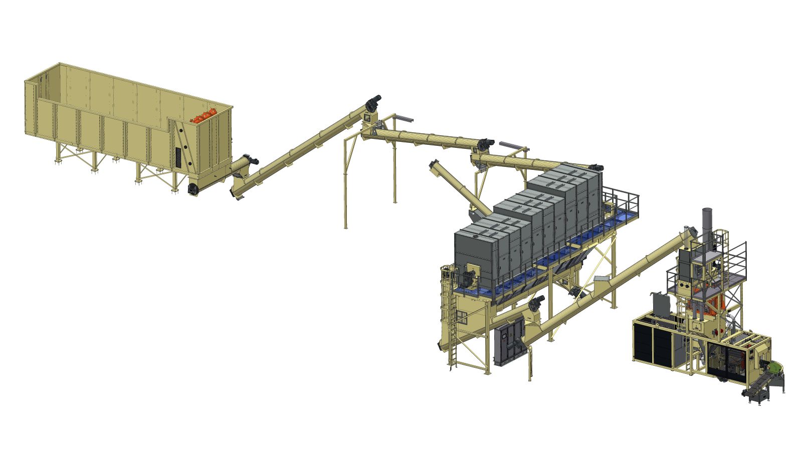 Complete infeed line with infeed hopper, eight transport augers and drum screen. In addition, an existing baler with infeed auger was disassembled at another location and rebuilt at this location.