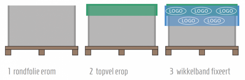 Les pierres sont emballées sur une palette, munie de bandes d'aluminium et d'une feuille supérieure. Le film complet se compose d'un film rond et d'une feuille supérieure en excès qui est tendue tout autour avec un ruban adhésif. Cela crée une unité solide avec des avantages prononcés pour la présentation et l'utilisation.