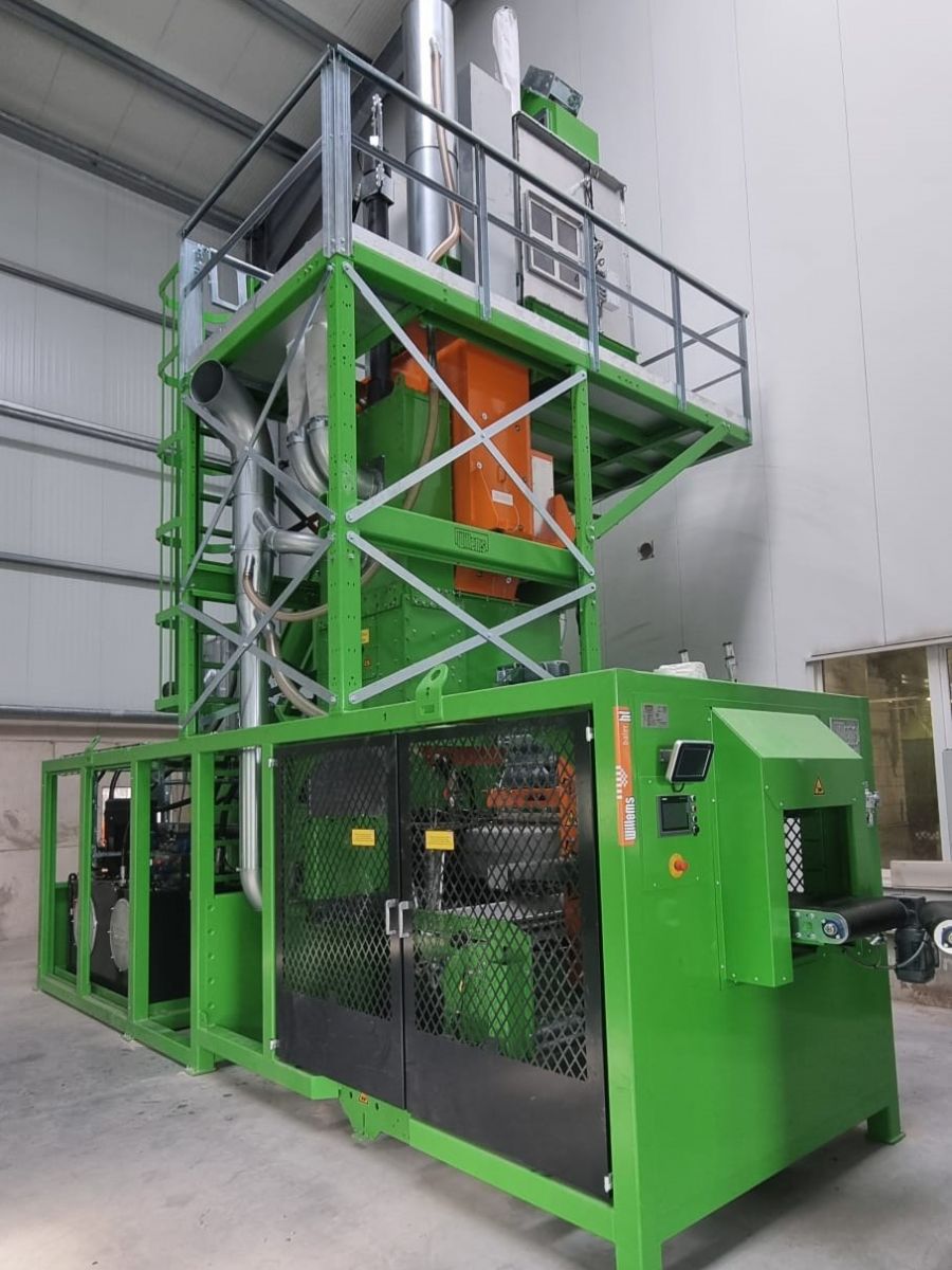 Willems a déjà livré une presse à balles pour le conditionnement et l'empilage de paille hachée. La paille hachée est mise en balles puis empilée automatiquement par un robot. La palette est ensuite enveloppée dans un film étirable, la protégeant ainsi de l'eau de pluie. Grâce à cette ligne entièrement automatisée et simple d'utilisation, un cariste n'a besoin de récupérer les palettes pleines qu'occasionnellement.