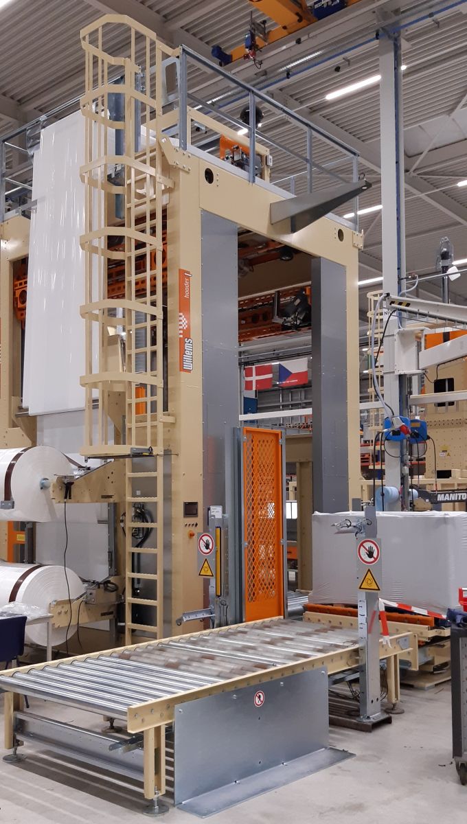 Machine à housse étirable Hooder L intégrée à la ligne de palettisation robotisée existante.