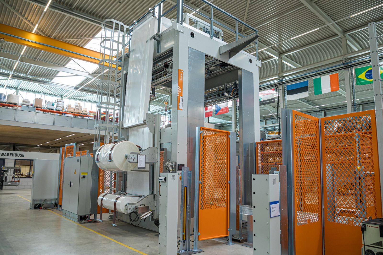 Entièrement équipé d'un empileur robot, avec remorque de tôles automatique et benne à balles. Une banderoleuse entièrement automatique a été ajoutée pour protéger les balles empilées contre le vent et les intempéries. Et la fin de la ligne se compose d'un système de collecte de convoyeur à rouleaux. Sur ce, les différentes tailles de palettes sont formées les unes à côté des autres ou derrière les autres, de sorte qu'un chariot élévateur peut éventuellement prendre plusieurs palettes en même temps. Pour réduire au minimum le trafic des chariots élévateurs.