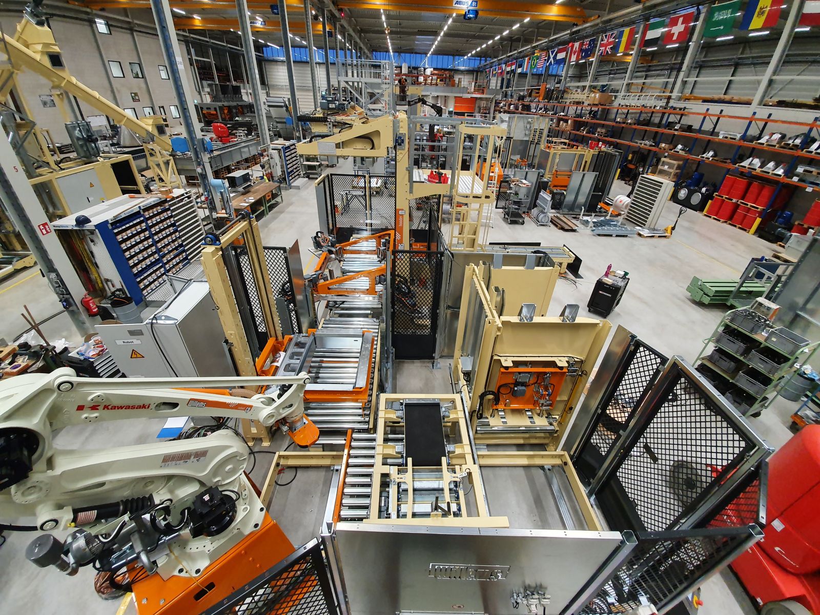 Ligne de conditionnement complète pour le conditionnement des pellets. Machine d'emballage FFS, robot de palettisation et hotte étirable. Le robot est empilé dans une cage. De cette façon, vous créez une charge de palette parfaite. poches qui se chevauchent et aucune cargaison saillante.