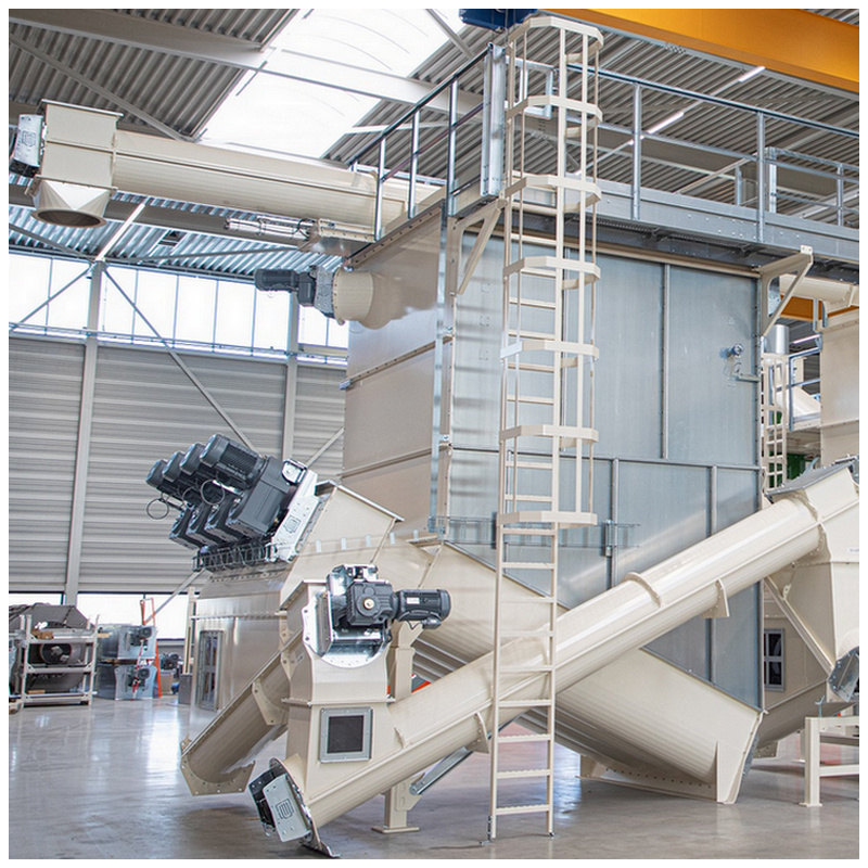 Willems heeft een complete aanvoerlijn geleverd met invoerbunker, acht transportschroeven en trommel...