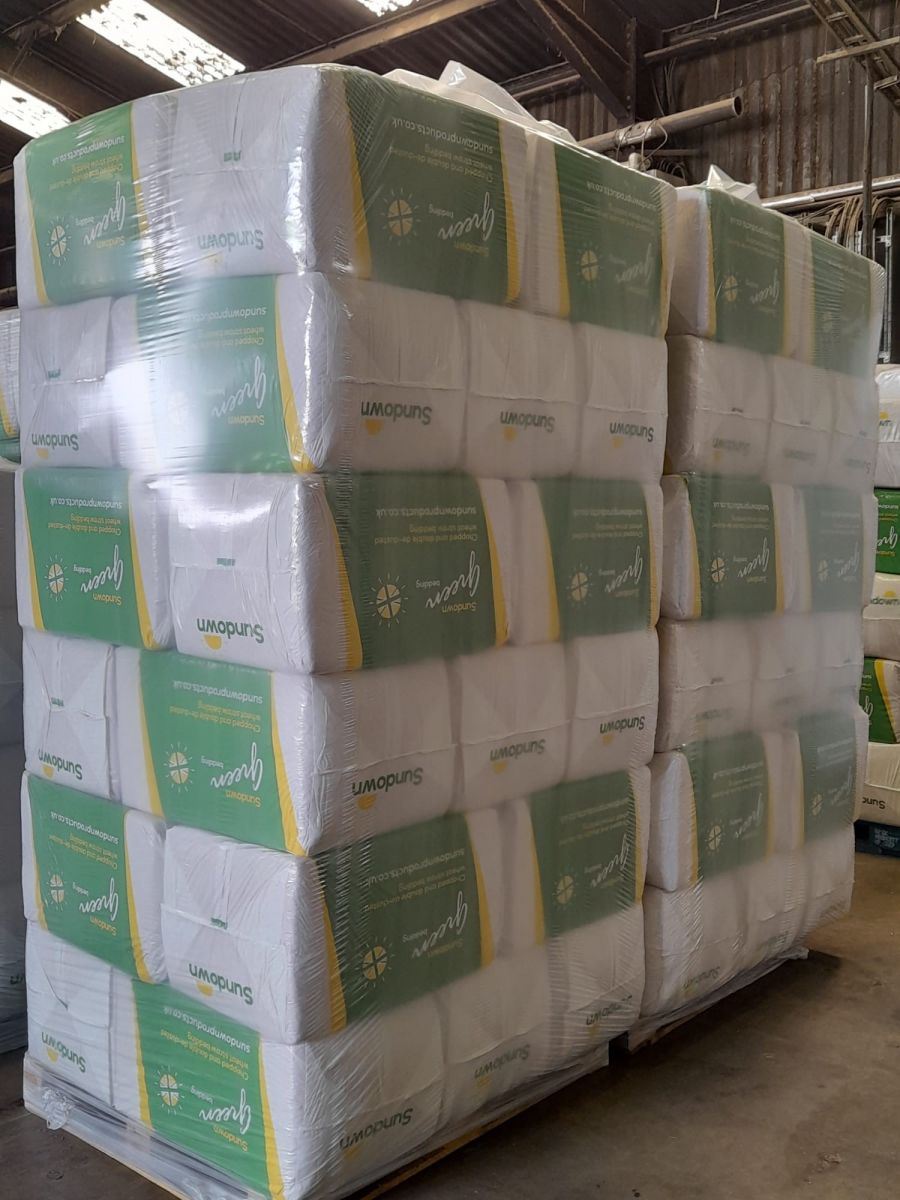 Geleverd een balenpers voor het persen en verpakken van gehakseld stro. Het stro wordt gebruikt als bodembedekking in stallen.