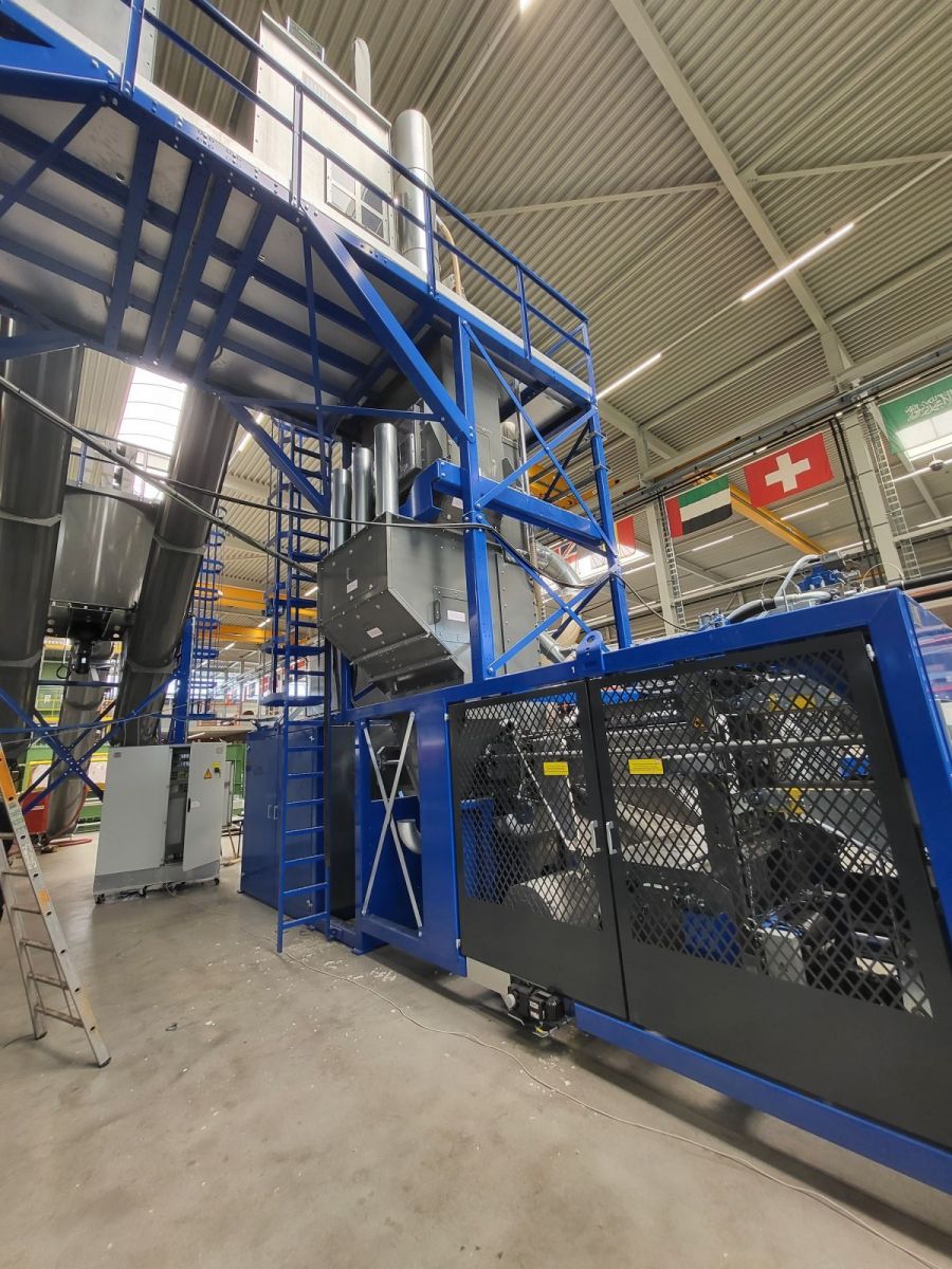 De totale capaciteit bedraagt tot wel 6 ton per uur. Het betreft een volautomatische balenpers, voorzien van een voorpersblok om ervoor te zorgen dat het product niet over-gecomprimeerd raakt, waardoor de optimale isolatiekwaliteit behouden blijft. Inclusief bufferbunkers met verdeelsysteem, zodat het product continu kan worden toegevoerd bij fluctuaties, terwijl het persproces in een constant tempo doorgaat. De lijn bevat een volautomatisch robotstapelsysteem, aangevuld met een controle weegsysteem, metaaldetectie en apparatuur voor het aanbrengen van prints/labels. De robot verwijdert ook balen uit de lijn die metaal bevatten of een onjuist gewicht hebben. Een volautomatische rekwikkelaar aan het einde van de lijn verpakt de eindpallets. Alles is klaar om goed verpakt naar de eindgebruiker te gaan, voor het isoleren van woningen met dit hoogwaardige, milieuvriendelijke isolatiemateriaal.