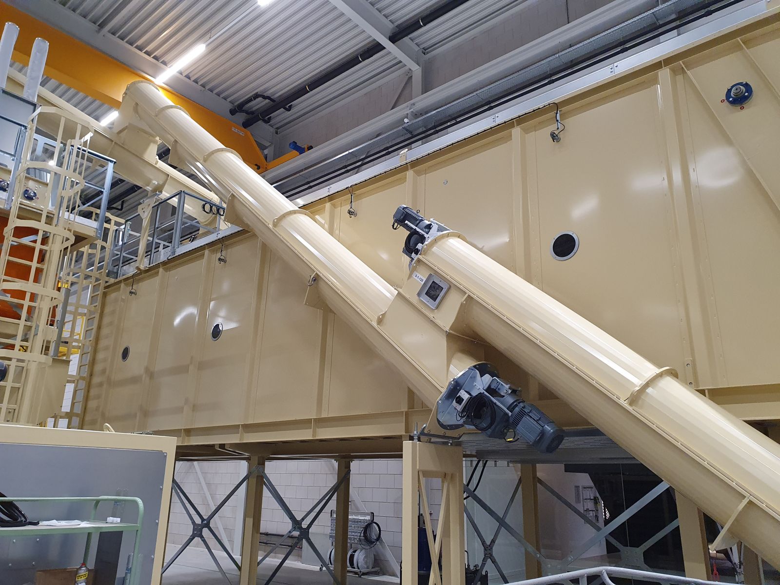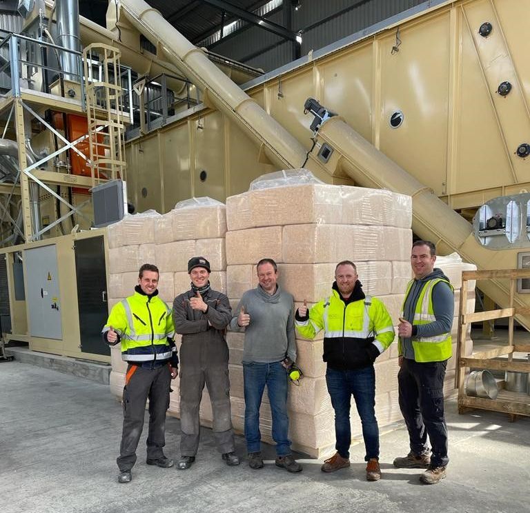 Complete verpakkings- en verwerkingslijn voor houtkrullen. Complete turn key installatie voor bufferen van houtkrullen, 105 m3 bunker met een transportvloer. Deze bunker buffert de houtkrullen, zodat de schaverij met meerdere ploegen kan produceren, terwijl het inpakken slechts in één ploegendienst plaatsvindt. Een trommelzeef is geïntegreerd om de fijnere deeltjes van de grotere houtkrullen te verwijderen, wat voor bepaalde soorten strooisel gewenst is. Het gereinigde schaafsel wordt in balen geperst en verpakt in degelijke logistiek correcte balen. Een robot stapelsysteem stapelt de balen automatisch op pallets. Nadat de balen op de pallet zijn gestapeld, worden ze automatisch door een Willems rekhoesmachine getransporteerd, om de balen te beschermen tegen regen en voor stabiliteit. Wederom een complete turn key fabrieksbouw en gemonteerd door Willems.