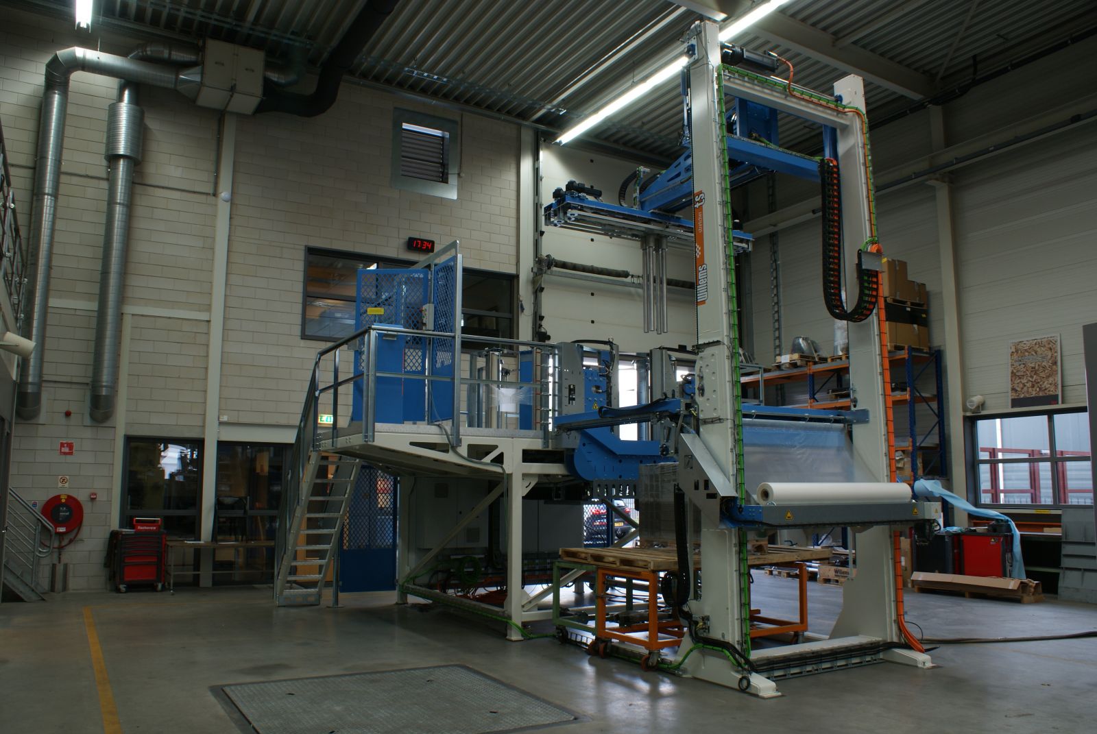 Een volledig automatische folieverpakkingsmachine voor pallets met gestapelde stenen.