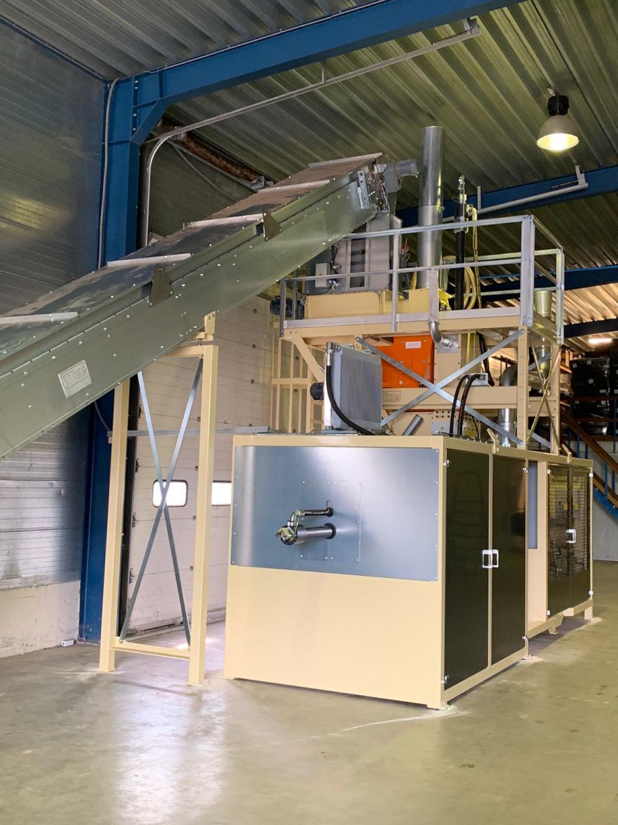 Deze Klein verpakkingsmachine kan wel 8 verschillende baalformaten produceren. De balen zijn bedoeld als strooisel voor huisdieren. Door een handgreep in de baal te maken is deze ook gemakkelijk te dragen.