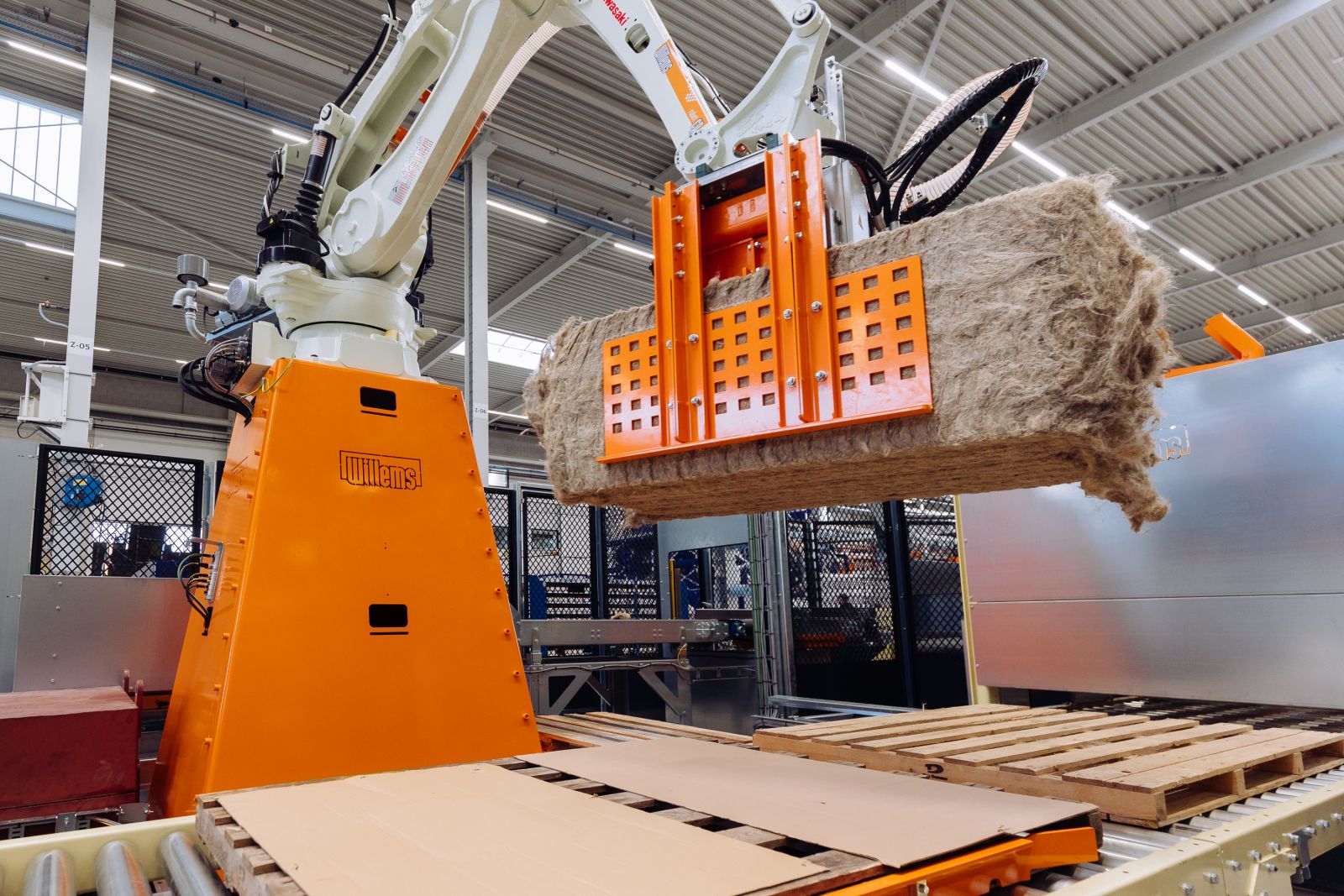 Een klant van Willems heeft tot 250 kilogram balen welke hij graag op een pallet gestapeld zou hebben, wat logistiek veel voordelen oplevert. Dit type robot in combinatie met de hydraulische grijperkop kan zelfs tot 320 kg balen liften. De balen worden ook gewogen en kunnen middels datablock worden uitgelezen door klant ten behoeve van gewichtsregistratie. De balen worden opgepakt middels een robot met hydraulische grijper. Dezelfde grijper heeft een inschakelbare vacuumkop waarmee kartonnen sheets op de pallet gelegd kunnen worden.