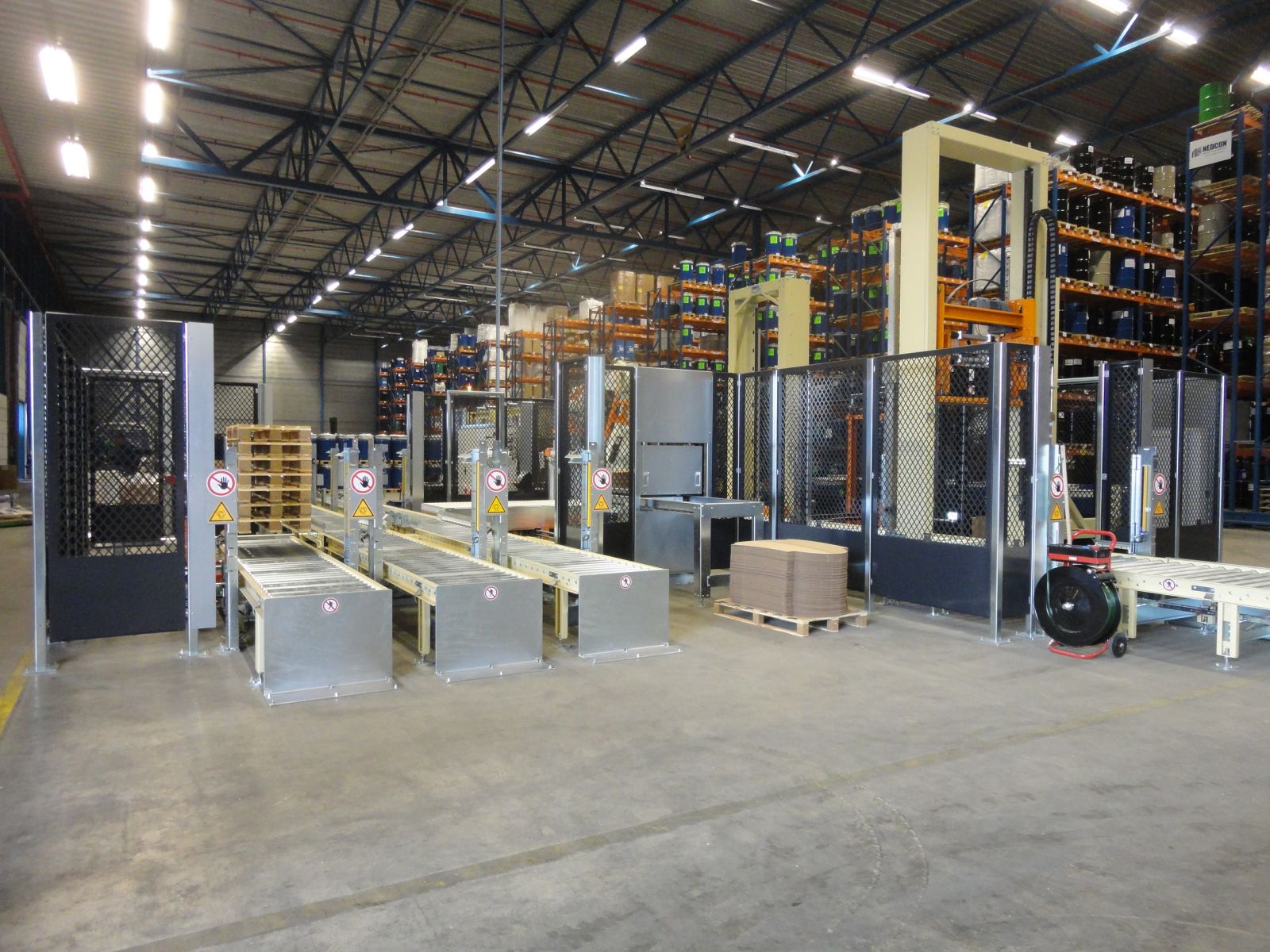 Een robot die de vaten voorziet van een label, op een pallet plaatst en het deksel beschermt met karton. De vaten worden vervolgens gestrapped.